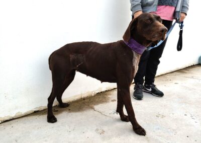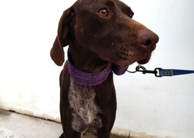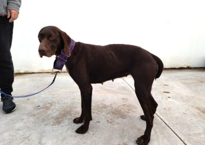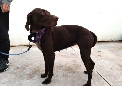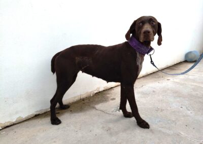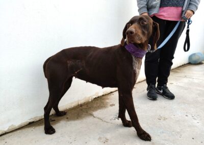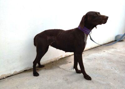 Glinda es una perrita bastante tímida, necesita coger confianza, suponemos que por la vida que ha debido tener anteriormente. Sin embargo es a la vez una perra muy equilibrada, tranquila, muy noble, sumisa y obediente. También es muy lista, y sabe algunas órdenes básicas. Es una perra perfecta para una familia.